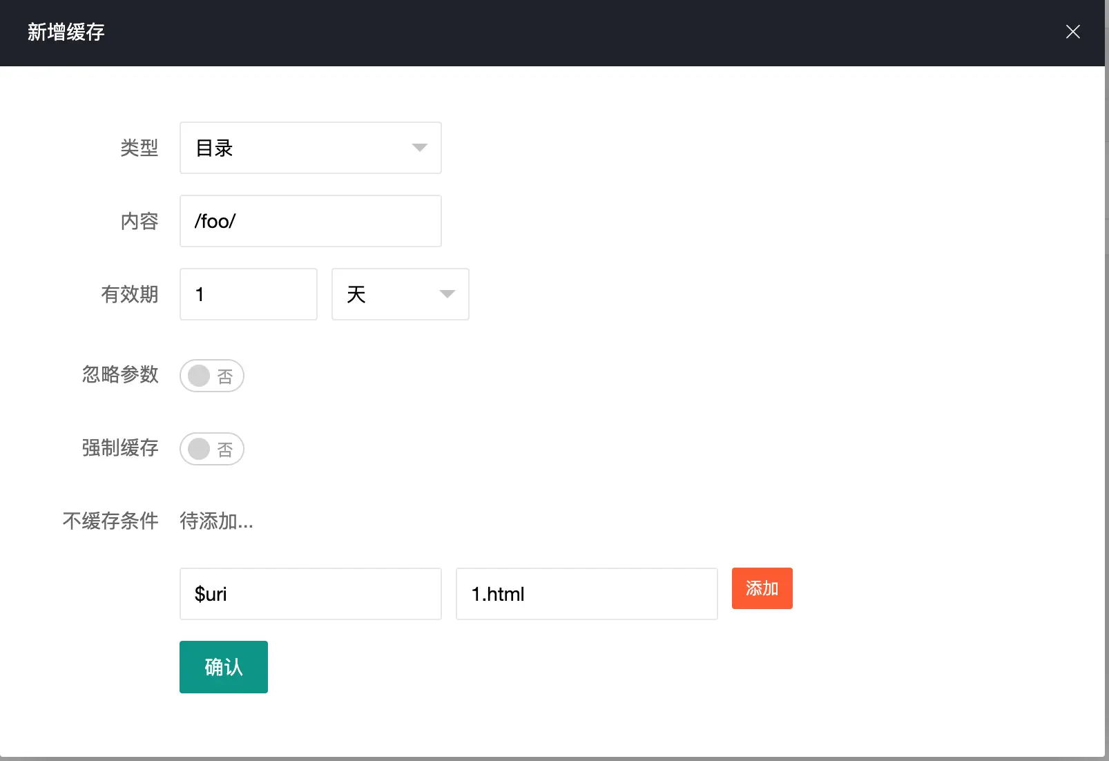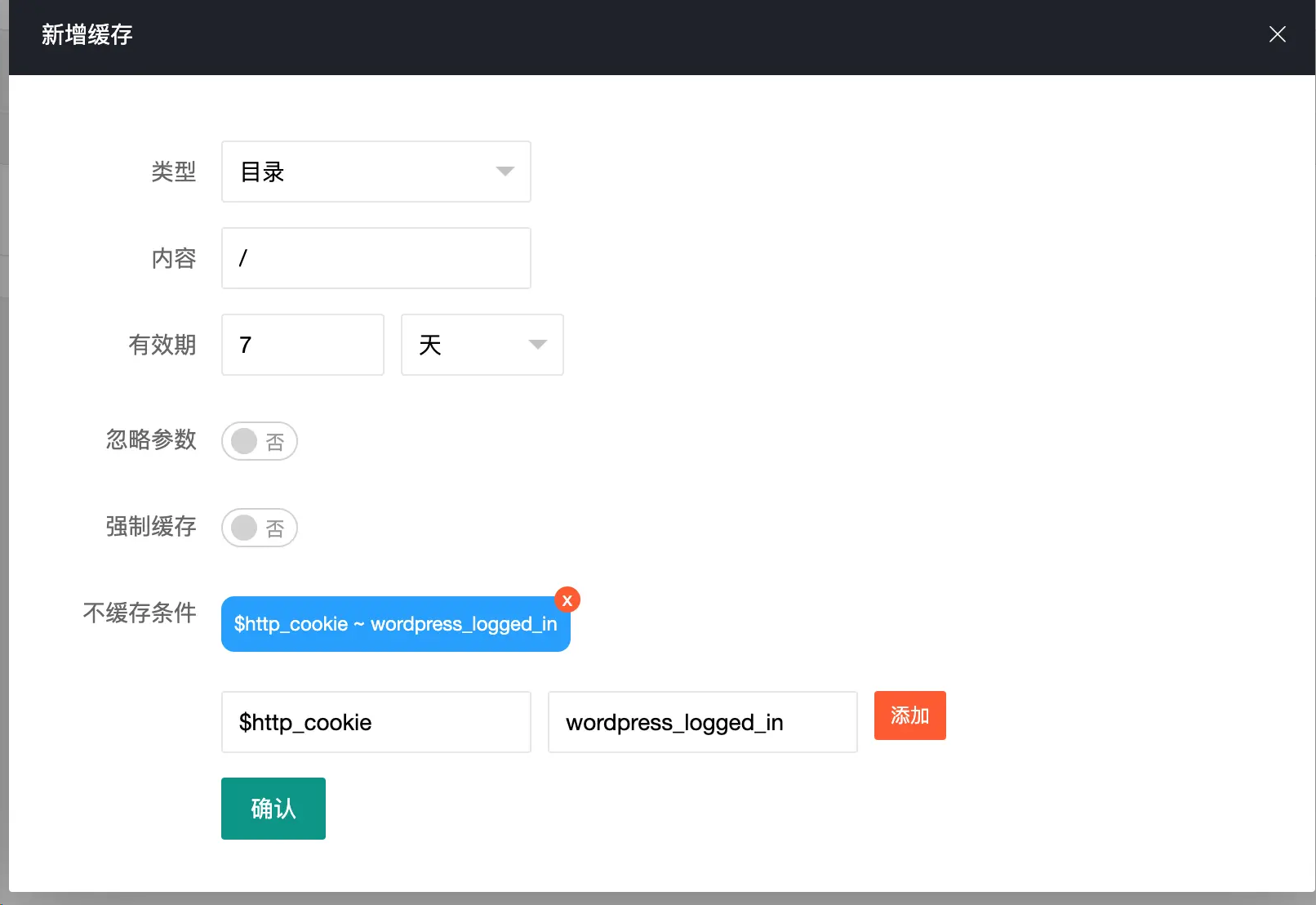 - 不缓存条件 - 设置某一特定的请求不缓存,比如缓存了整个网站除了客户端带指定cookie名为wordpress_logged_in的请求,那么可以变量输入$http_cookie,字符串输入wordpress_logged_in。